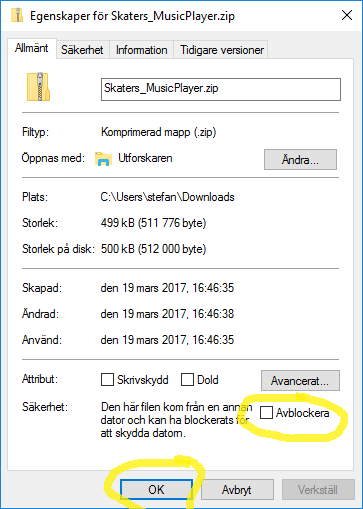 Då hämtade filer från internet automatiskt blir markerade som osäkra kan du först avblockera filer för att slippa lite kontrollfrågor.