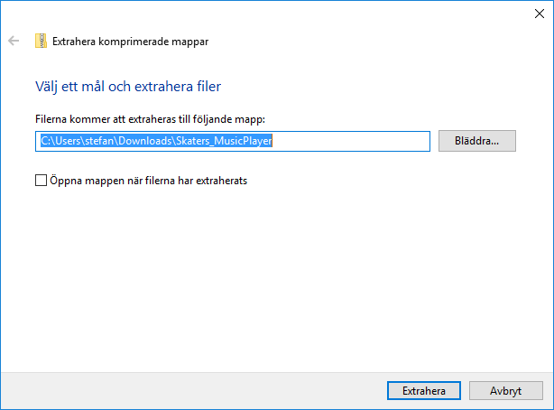 I rutan som sedan kommer upp kan du välja vilken mapp du vill packa upp filerna till. Lämplig kan vara att ange t.ex. tävlingens namn. Klicka sedan på Extrahera för att packa upp filerna i vald mapp. | ![]() |