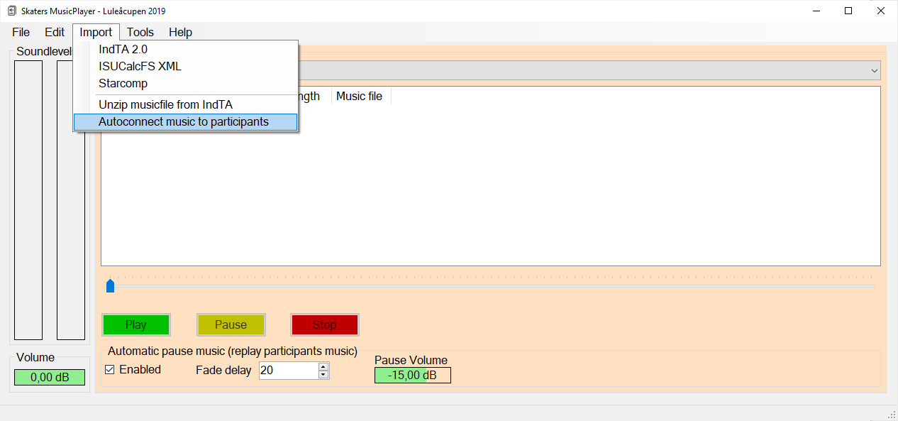 Efter att du laddat hem musiken och anmälningsfilen från IndTA så kan programmet automatisk koppla musiken till rätt åkare. Välja Edit / Autoconnect music to skater Är det många åkare anmälda kan det ta en stund att göra kopplingen så programmet också kontrollerar att musikfilen är spelbar, samt att en checksumma beräknas för att senare verifiera att musiken inte är ändrad. | ![]() |