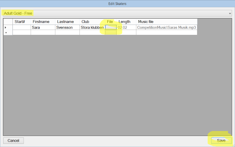 Välj vilken klass och i listan med åkare klickar du på knappen under File för att kunna välja rätt musikfil. En vanlig "Öppna fil" rutan öppnas och du kan peka ut filen som du vill koppla till åkaren. Klicka sedan Save för att återgå till startbilden. Det är dock en stor fördel om man i möjligaste mån använder SportTAs musikhantering och namnsättning på filerna. | ![]() |