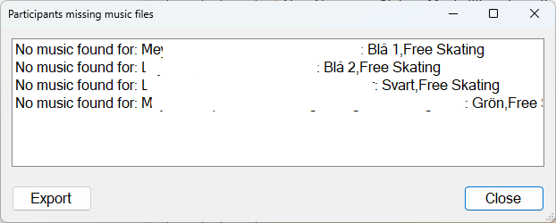 Om inte alla åkare kunde kopplas till musiken så får man ett felmeddelande med vilka åkare som saknar musik Kontakta dessa och be dem uppdatera sin musik i SportTA så du kan ladda hem en uppdaterad musikfil Det är också möjligt att exportera listan till en textfil | ![]() |