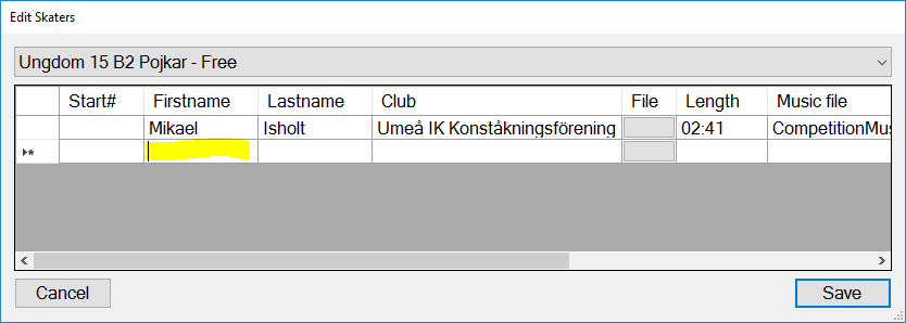 Markera raden efter sista åkaren och lägg in uppgifterna på åkaren. Du måste också koppla musiken manuellt Koppla musik till åkare | ![]() |
