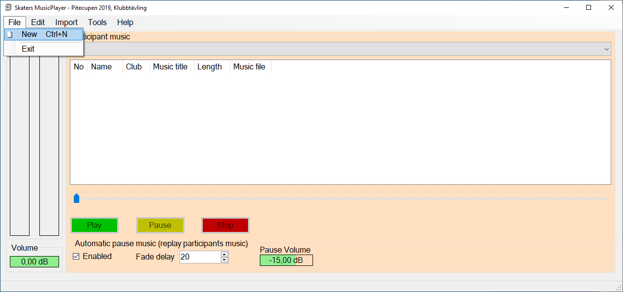Om man vill börja om med en hel tävling, så kan man göra detta via menyvalet File / New. T.ex. om man har fått en avanmälan efter man har importerat filen från IndTA så det inte finns åkare kvar i klassen eller man har strukit hela klasser. | ![]() |