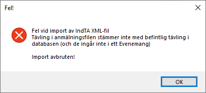 | Om du läser in flera tävlingar måste de svara kopplade till ett evenemang annars får du ett felmeddelande och importen avbryts. | ![]() |