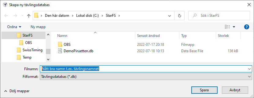 | Välj en lämplig mapp och filnamn för att skapa tävlingsdatabasen och klicka på Spara | ![]() |