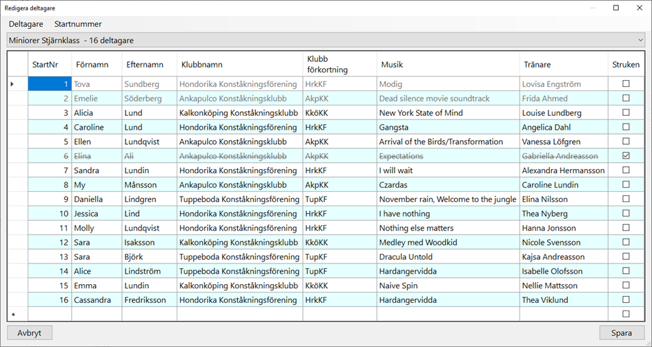 Före fastställande av startordning kan man radera deltagare från vald klass. Efter startnummer är genererat måste man istället markera åkaren som struken
