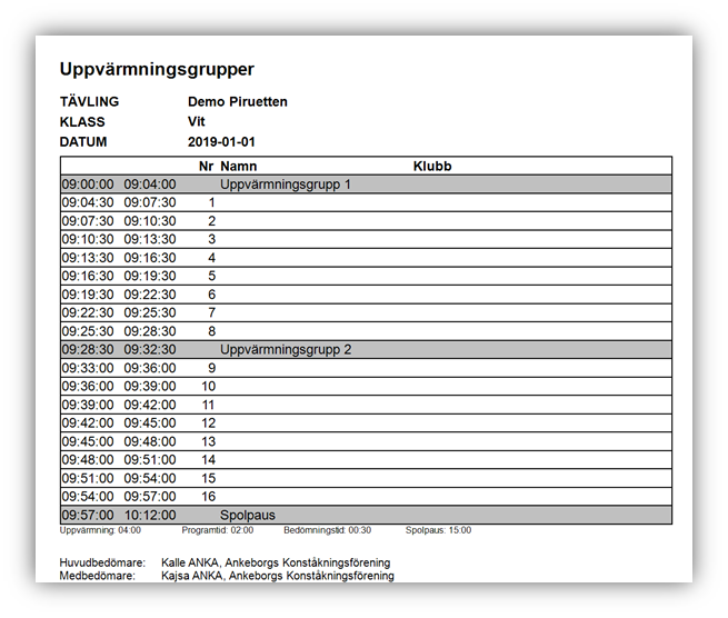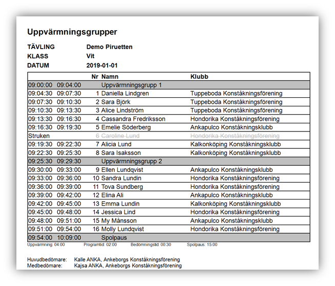 Rapporten visar detaljerade tider för Uppvärmningsgrupper, Startnummer, Spolpauser samt Paus. Är någon deltagare struken markeras även detta.
