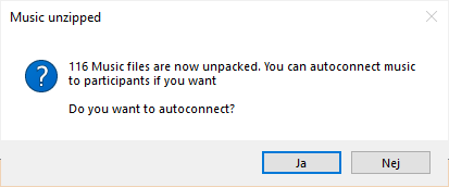 Efter uppackningen är klar kommer en meddelanderuta hur många filer som packats upp Du kan höär direkt också göra en automatisk koppling till åkarna. Klicka i så fall på Yes / Ja. Det går även att göra manuellt via: Koppla musik till åkare | ![]() |