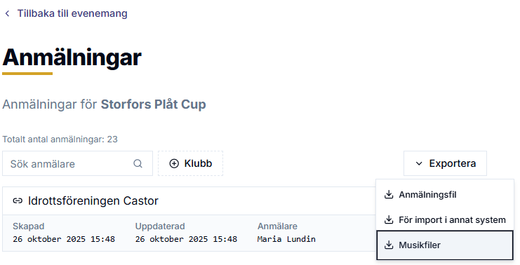 Logga in i SportTA och gå till ditt evenemang Under menyn Alternativ Välj Gjorda anmälningar | ![]() |